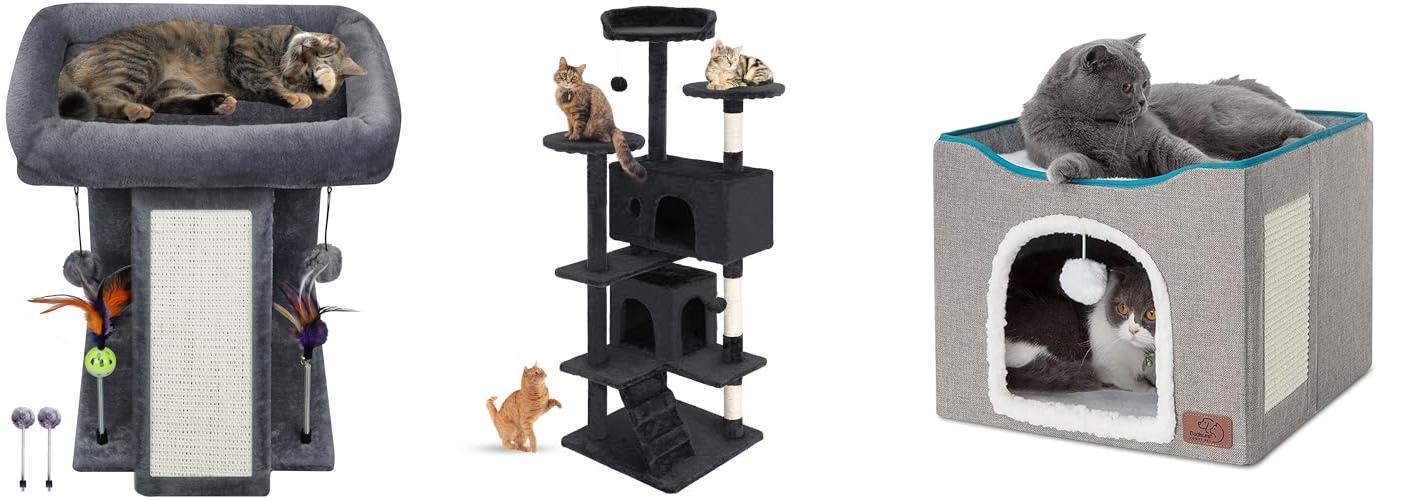 • Size and Space: Big cats need room to stretch, play, and sleep comfortably. Look for furniture that is wider and taller than average. A scratching post should be tall enough for your cat to fully extend its body. A cat tree needs sturdy platforms that can hold their weight.