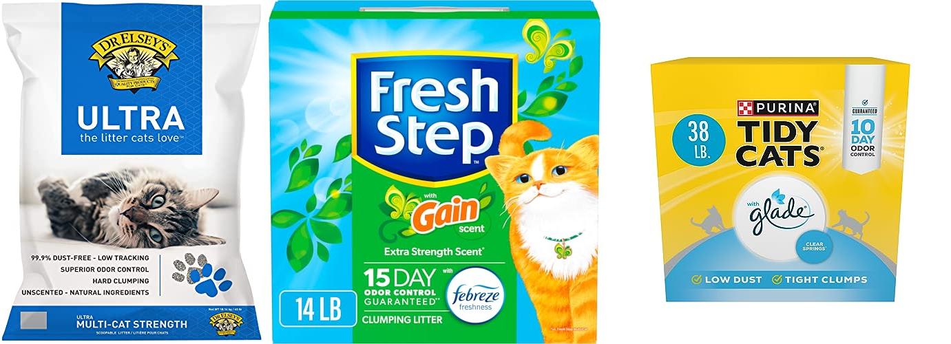 A: Clumping clay litters and crystal litters are usually the best for odor control. Some natural litters also work well.