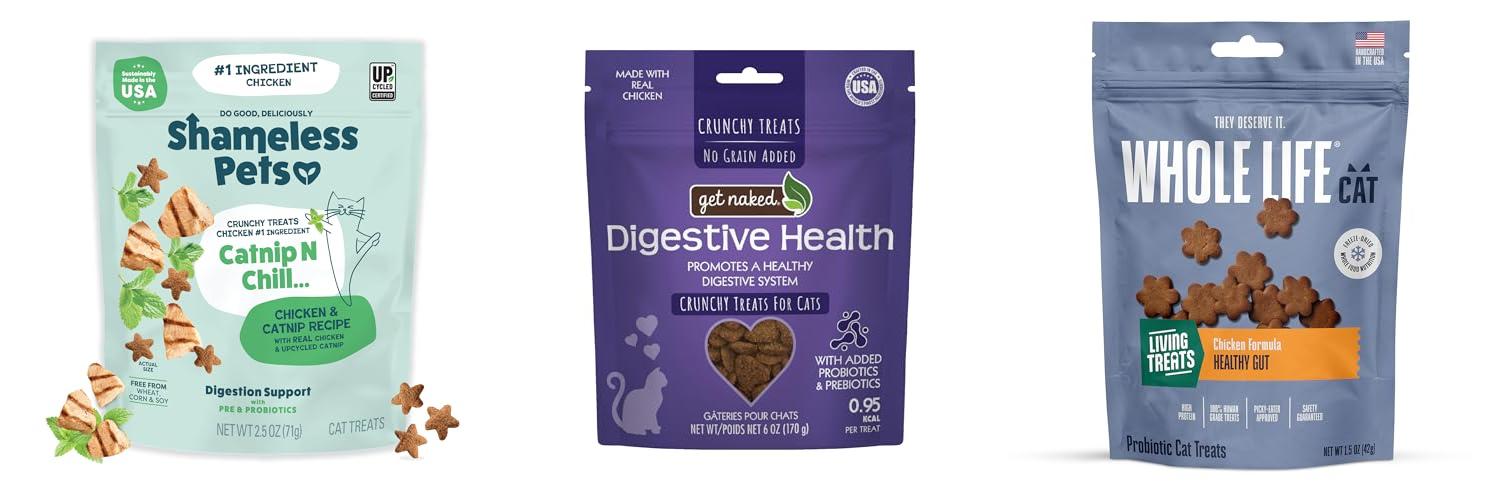 - These treats contain prebiotics and probiotics, like B. coagulans, which actively help your cat’s digestion.